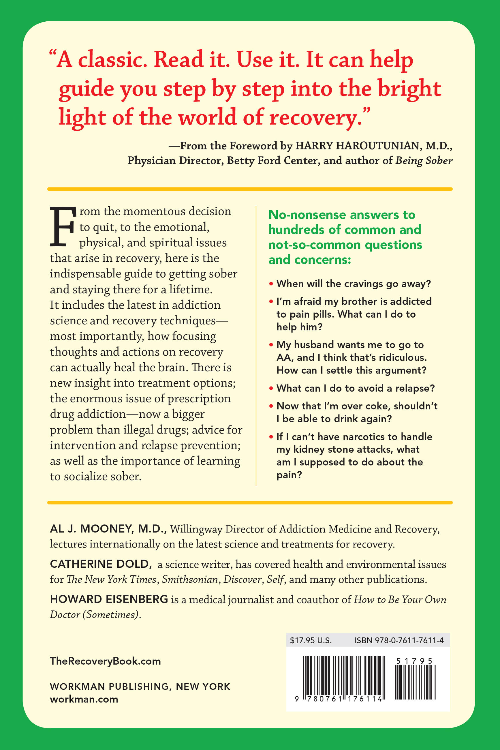 Written by Al J. Mooney, M.D., a recovery activist who speaks internationally on recovery, and health journalists Catherine Dold and Howard Eisenberg, The Recovery Book covers all the latest in addiction science and recovery methods. In 26 chapters and over 600 pages, The Recovery Book tackles issues such as: