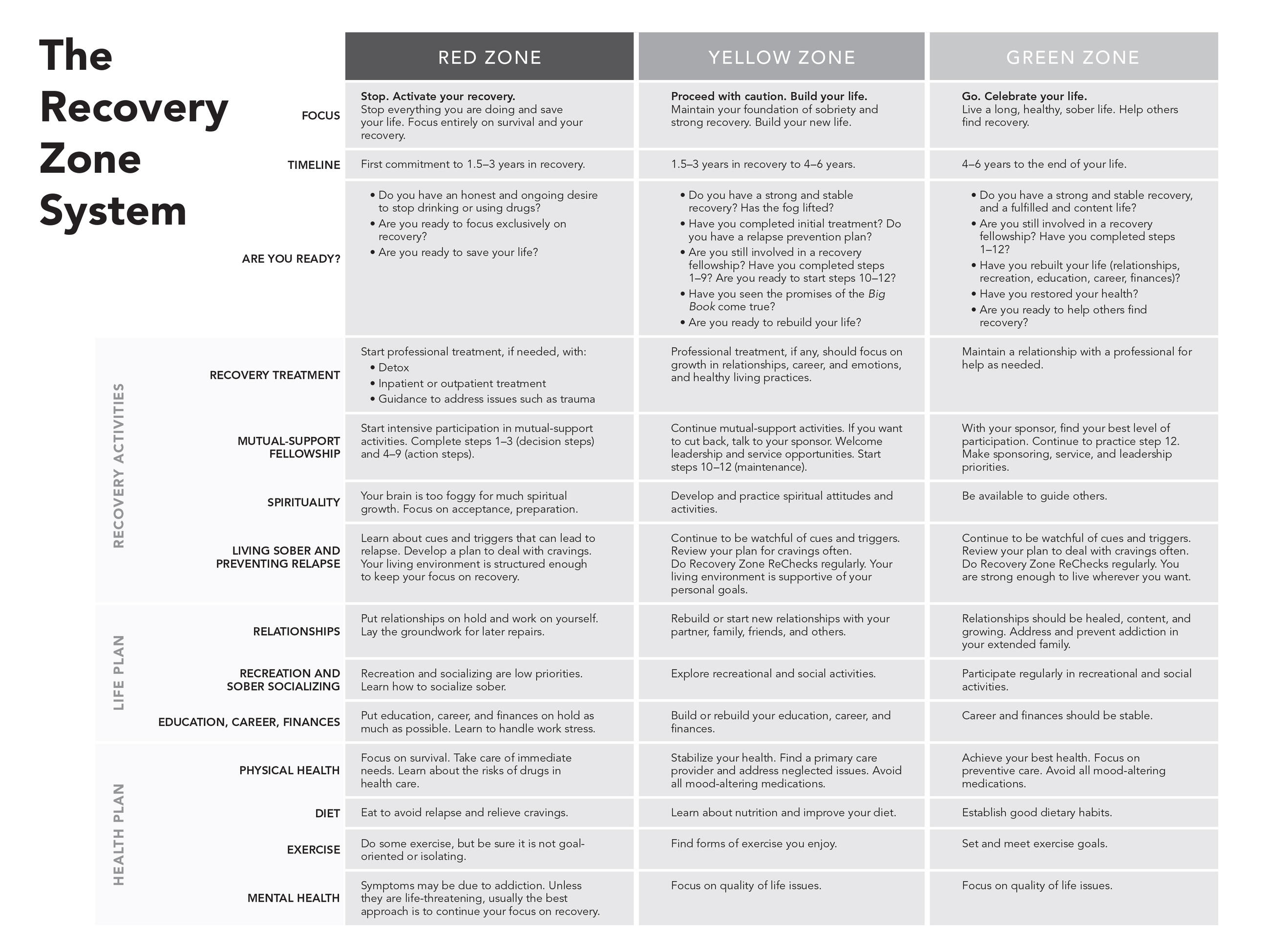 This new edition features the revolutionary Recovery Zone System, which divides a life in recovery into three chronological zones and provides guidance on exactly what to do in each zone. First is the Red Zone, where the reader is encouraged to stop everything, activate their recovery and save their life. Next is the Yellow Zone, where the reader can begin to rebuild a life that was torn apart by addiction. Finally, the reader reaches the Green Zone, where they can enjoy a life of recovery and help others. And the Recovery Zone ReCheck is a simple and effective relapse prevention tool. The Recovery Zone System works hand-in-hand with the 12-step philosophy and all other recovery methods.
