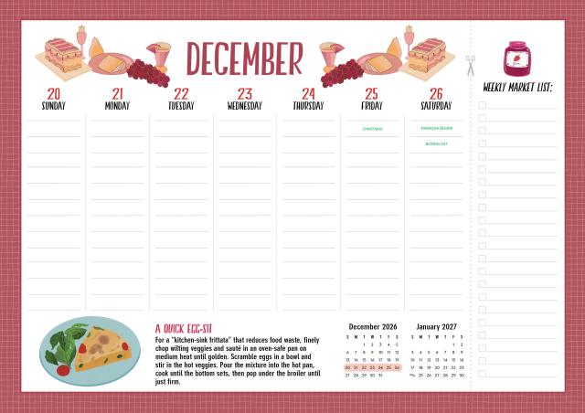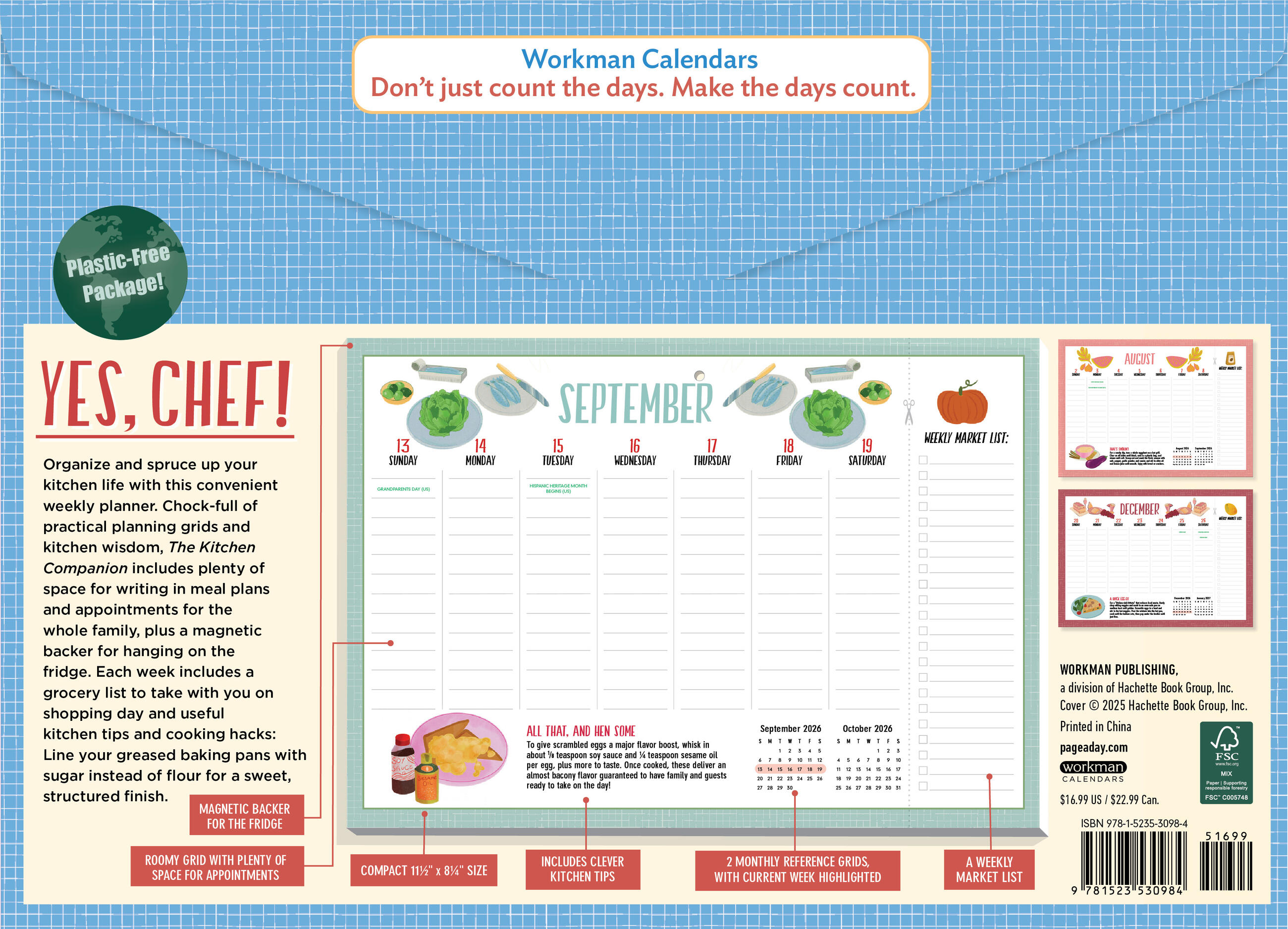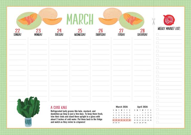 • THE ULTIMATE KITCHEN CALENDAR: Includes space for your grocery list, clever kitchen tips, and charming food-themed illustrations to cheer up your meal planning.