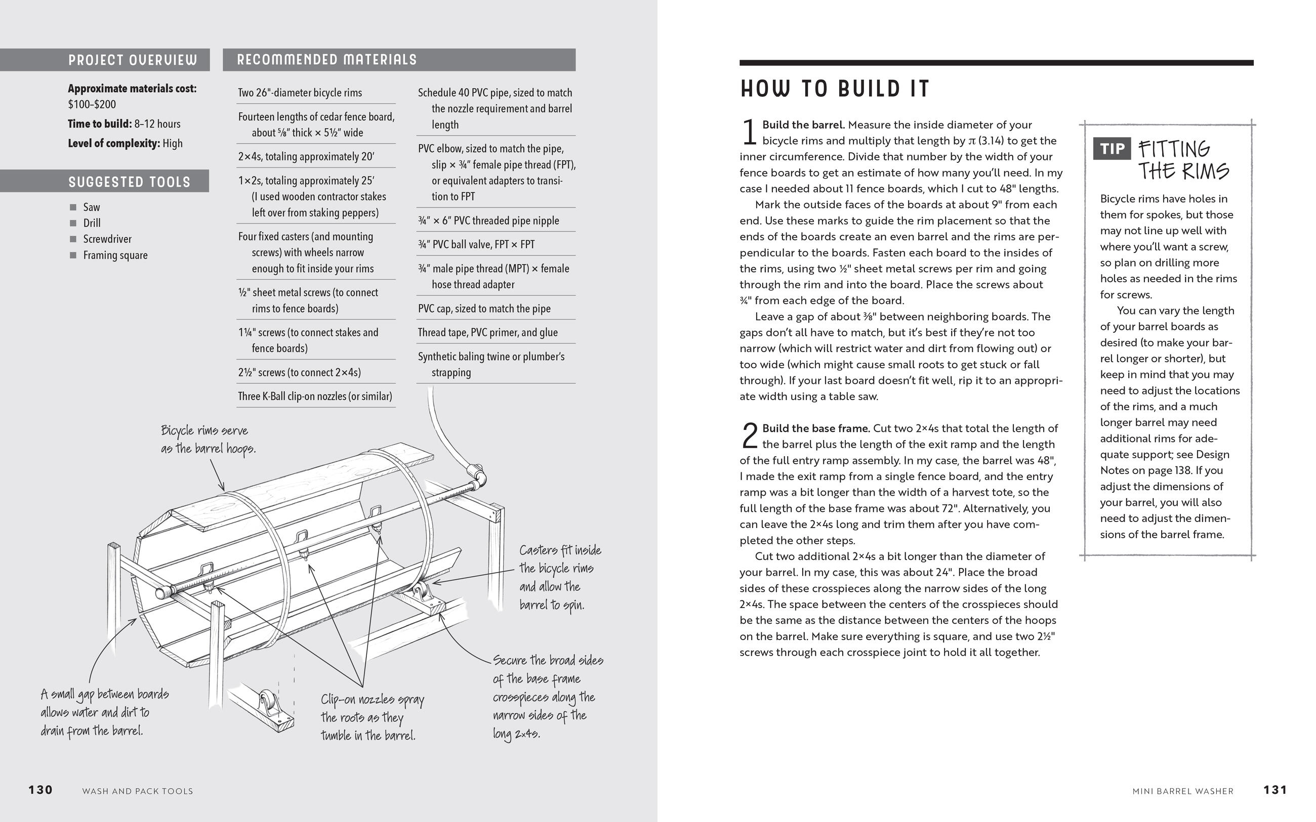 Volk begins with the basics, such as setting up a workshop and understanding design principles, mechanical principles, and materials properties, then presents plans for making 15 tools suited to small-farm tasks and processes. Each project includes an explanation of the tool’s purpose and use, as well as the time commitment, skill level, and equipment required to build it. Projects range from the super-simple (requiring a half-day to build) to the more complex, and include how-to photographs and illustrations with variations for customizing the finished implement. Along with instructions for building items such as simple seedling benches, a mini barrel washer, a DIY germination chamber, and a rolling pack table, Volk addresses systems design for farm efficiency, including how to design an effective drip irrigation system and how to set up spreadsheets for collecting important planning, planting, and market data.