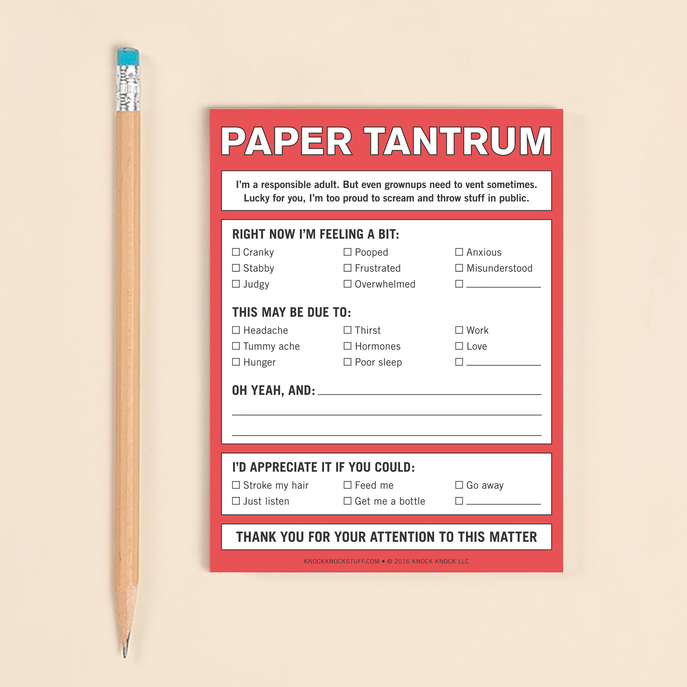 When it comes to meltdowns, babies get all the excuses: “She’s hungry.” “He’s overtired.” “She needs a change.” Reclaim your right to throw a fit at any age with this expressive pad, while maintaining your reputation for professionalism and maturity.